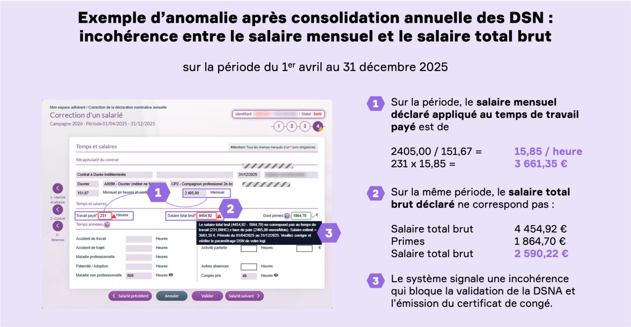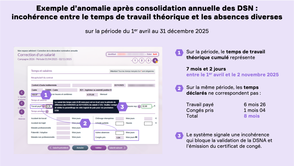 À l’occasion de la DSN annuelle (consolidation des DSN mensuelles correspondant à la période d’acquisition des droits à congé des salariés, d'avril 2025 à mars 2026), les contrôles effectués par la caisse peuvent révéler des incohérences dont la résolution est nécessaire pour l’établissement des certificats de congés.